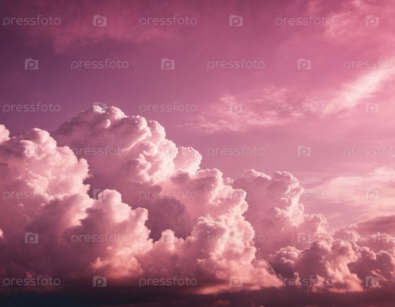 Прекрасный вид на розовые облака в ярком закате неба. Облака пушистые и полны света, создавая потрясающий визуальный дисплей. Драматические нереальные небеса с кучевыми и стратовыми облаками в атмосфере. искусство