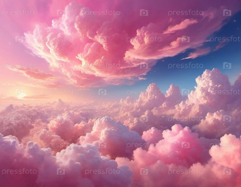 Прекрасный вид на розовые облака в ярком закате неба. Облака пушистые и полны света, создавая потрясающий визуальный дисплей. Драматические нереальные небеса с кучевыми и стратовыми облаками в атмосфере. искусство