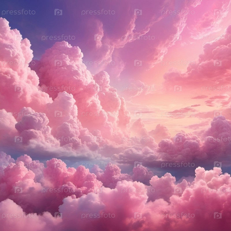Прекрасный вид на розовые облака в ярком закате неба. Облака пушистые и полны света, создавая потрясающий визуальный дисплей. Драматические нереальные небеса с кучевыми и стратовыми облаками в атмосфере. Искусство