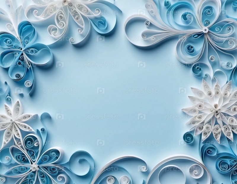 Бумажные цветы, изготовленные с использованием техники quilling. Цветы находятся в оттенках синего, а светло-голубые расположены по кругу на фоне. Каркас с пространством для копирования. генерируемый