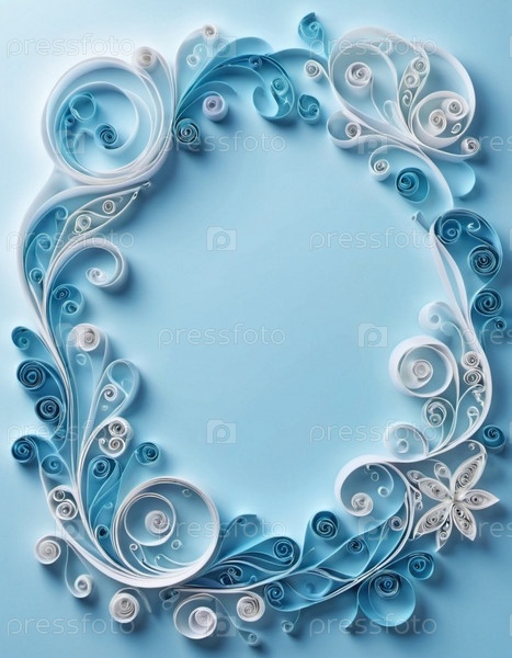 Бумажные цветы, изготовленные с использованием техники quilling. Цветы находятся в оттенках синего, а светло-голубые расположены по кругу на фоне. Каркас с пространством для копирования. генерируемый