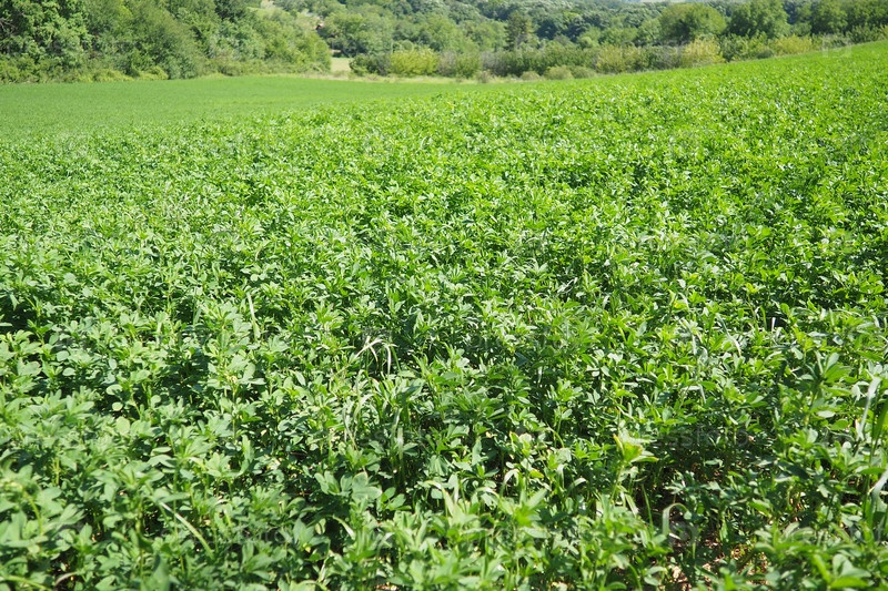 Зеленый клевер. Организованная посадка клевера. Clover Trifolium, растения семейства бобовых Fabaceae, Moth Faboideae. Сельскохозяйственная культура медоносная, кормовая, зеленый навоз. Фруска Гора, Сербия