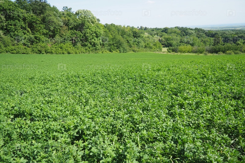 Зеленый клевер. Организованная посадка клевера. Clover Trifolium, растения семейства бобовых Fabaceae, Moth Faboideae. Сельскохозяйственная культура медоносная, кормовая, зеленый навоз. Фруска Гора, Сербия