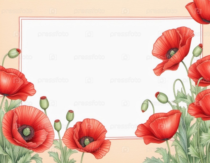 Красные маки с зелеными листьями и стеблями. Маки изображены в различных стадиях цветения, некоторые полностью открыты, а другие в зародыше. Мягкая спина, создающая деликатное и романтическое ощущение