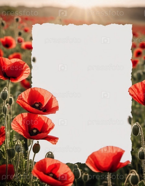 Красные маки с зелеными листьями и стеблями. Маки изображены в различных стадиях цветения, некоторые полностью открыты, а другие в зародыше. Мягкая спина, создающая деликатное и романтическое ощущение