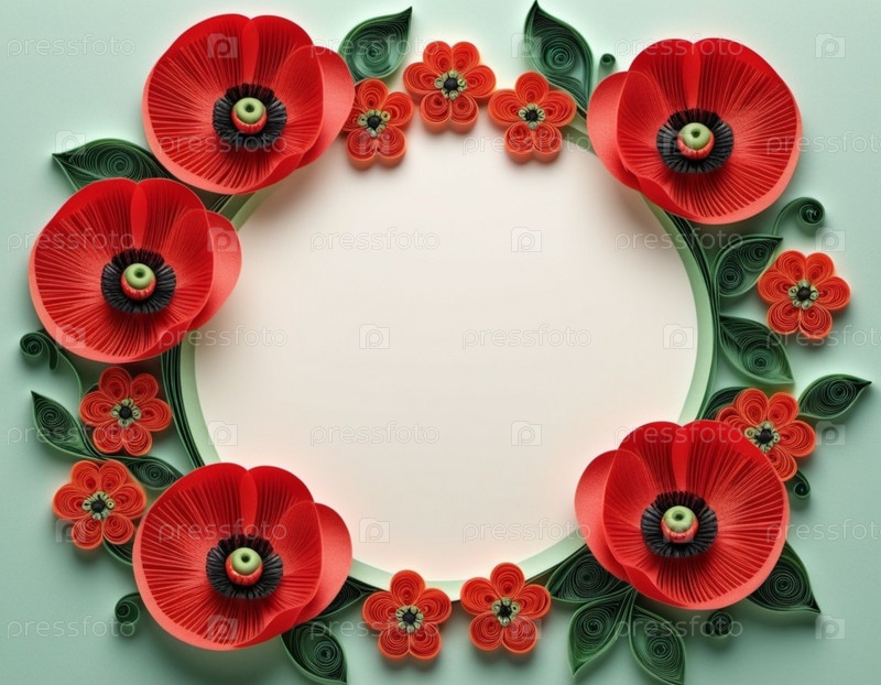 Красные маки с зелеными листьями и стеблями. Маки изображены в различных стадиях цветения, некоторые полностью открыты, а другие в зародыше. Мягкая спина, создающая деликатное и романтическое ощущение