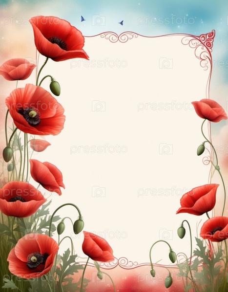 Красные маки с зелеными листьями и стеблями. Маки изображены в различных стадиях цветения, некоторые полностью открыты, а другие в зародыше. Мягкая спина, создающая деликатное и романтическое ощущение