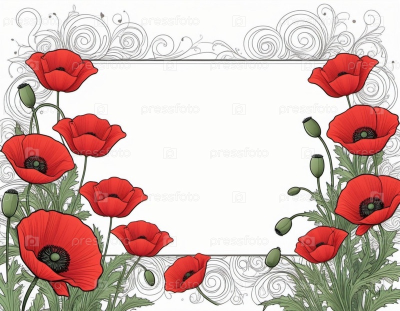 Красные маки с зелеными листьями и стеблями. Маки изображены в различных стадиях цветения, некоторые полностью открыты, а другие в зародыше. Мягкая спина, создающая деликатное и романтическое ощущение