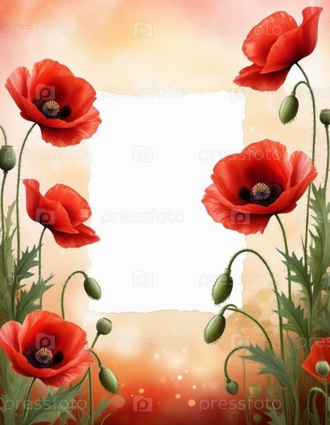 Красные маки, зеленые листья, стебли. Щенки изображены на различных стадиях цветения, причем некоторые полностью открыты, а другие в зародыше. Мягкая спина, создающая нежные романтические ощущения. Копируйте пространство. Открытка или макет