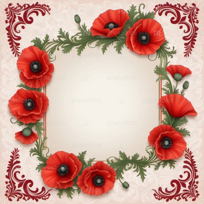Красные маки, зеленые листья, стебли. Щенки изображены на различных стадиях цветения, причем некоторые полностью открыты, а другие в зародыше. Мягкая спина, создающая нежные романтические ощущения. Копируйте пространство. Открытка или макет