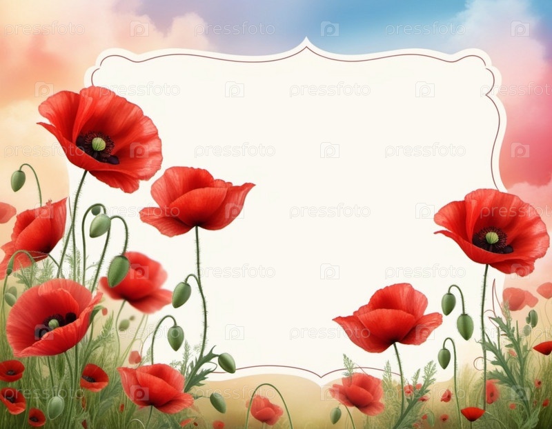 Красные маки, зеленые листья, стебли. Щенки изображены на различных стадиях цветения, причем некоторые полностью открыты, а другие в зародыше. Мягкая спина, создающая нежные романтические ощущения. Копируйте пространство. Открытка или макет