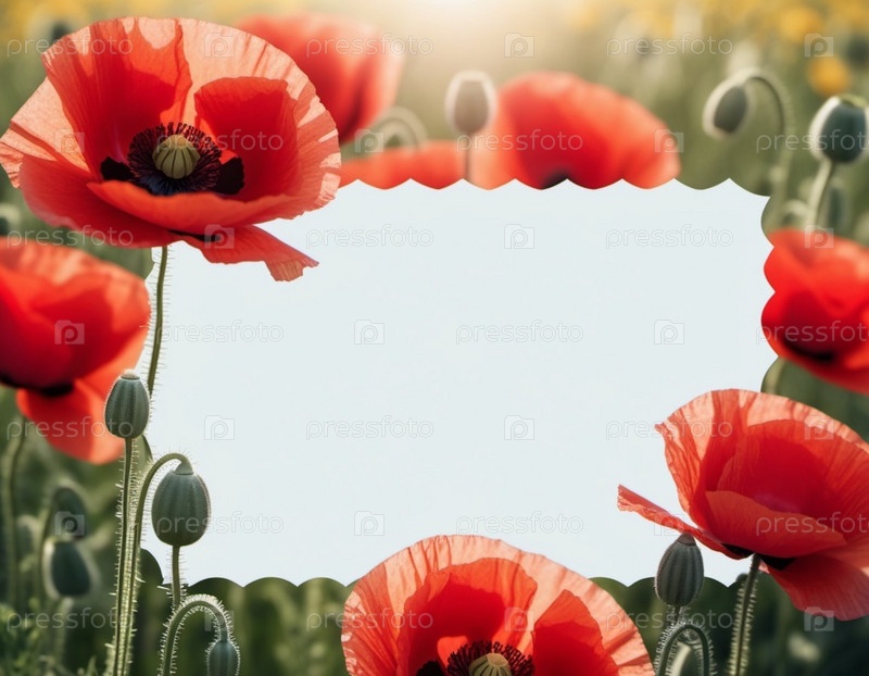 Красные маки, зеленые листья, стебли. Щенки изображены на различных стадиях цветения, причем некоторые полностью открыты, а другие в зародыше. Мягкая спина, создающая нежные романтические ощущения. Копируйте пространство. Открытка или макет