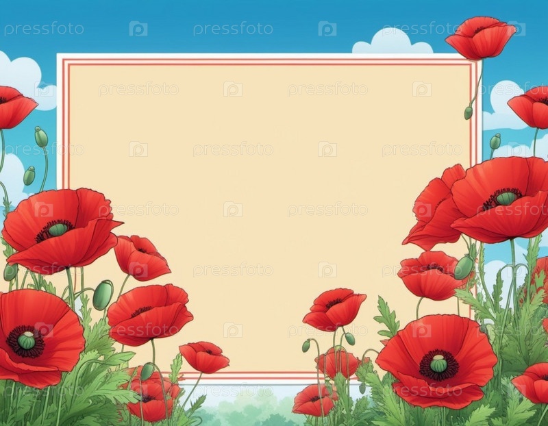 Красные маки, зеленые листья, стебли. Щенки изображены на различных стадиях цветения, причем некоторые полностью открыты, а другие в зародыше. Мягкая спина, создающая нежные романтические ощущения. Копируйте пространство. Открытка или макет