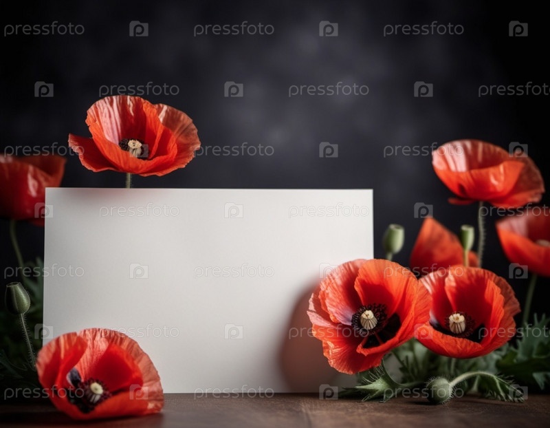 Красные маки, зеленые листья, стебли. Щенки изображены на различных стадиях цветения, причем некоторые полностью открыты, а другие в зародыше. Мягкая спина, создающая нежные романтические ощущения. Копируйте пространство. Открытка или макет
