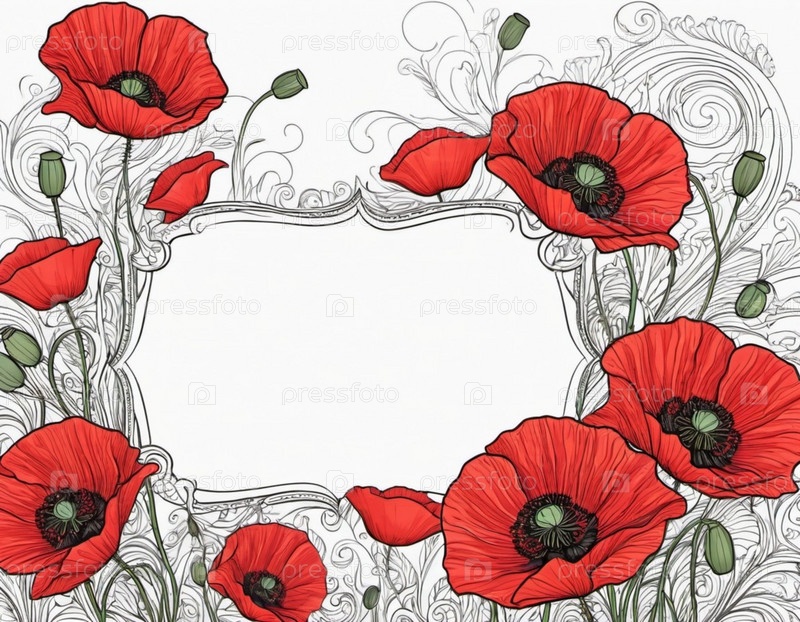 Красные маки, зеленые листья, стебли. Щенки изображены на различных стадиях цветения, причем некоторые полностью открыты, а другие в зародыше. Мягкая спина, создающая нежные романтические ощущения. Копируйте пространство. Открытка или макет