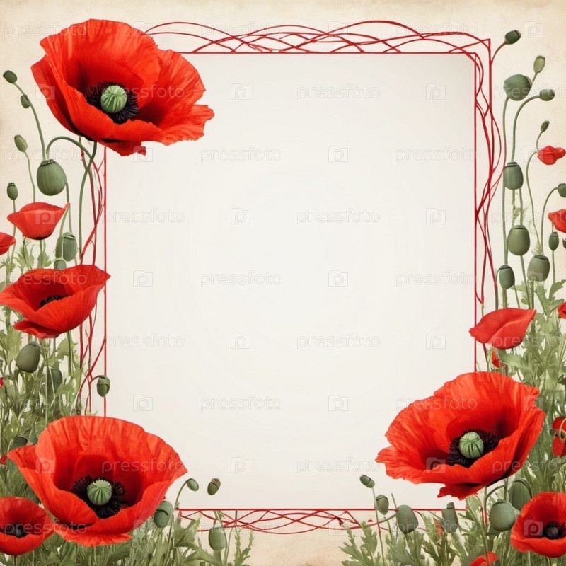 Красные маки, зеленые листья, стебли. Щенки изображены на различных стадиях цветения, причем некоторые полностью открыты, а другие в зародыше. Мягкая спина, создающая нежные романтические ощущения. Копируйте пространство. Открытка или макет