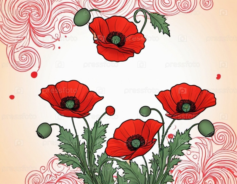 Красные маки с зелеными листьями и стеблями. Маки изображены в различных стадиях цветения, некоторые полностью открыты, а другие в зародыше. Мягкая спина, создающая деликатное и романтическое ощущение