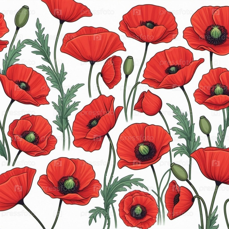 Красные маки, зеленые листья, стебли. Щенки изображены на различных стадиях цветения, причем некоторые полностью открыты, а другие в зародыше. Мягкая спина, создающая нежные романтические ощущения. Копируйте пространство. Открытка или макет