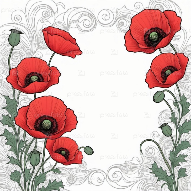 Красные маки с зелеными листьями и стеблями. Маки изображены в различных стадиях цветения, некоторые полностью открыты, а другие в зародыше. Мягкая спина, создающая деликатное и романтическое ощущение