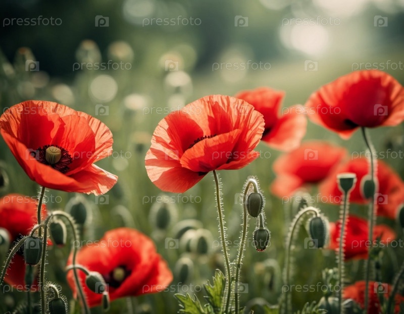 Красные маки, зеленые листья, стебли. Щенки изображены на различных стадиях цветения, причем некоторые полностью открыты, а другие в зародыше. Мягкая спина, создающая нежные романтические ощущения. Копируйте пространство. Открытка или макет