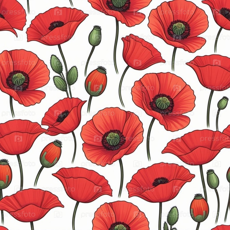 Красные маки, зеленые листья, стебли. Щенки изображены на различных стадиях цветения, причем некоторые полностью открыты, а другие в зародыше. Мягкая спина, создающая нежные романтические ощущения. Копируйте пространство. Открытка или макет