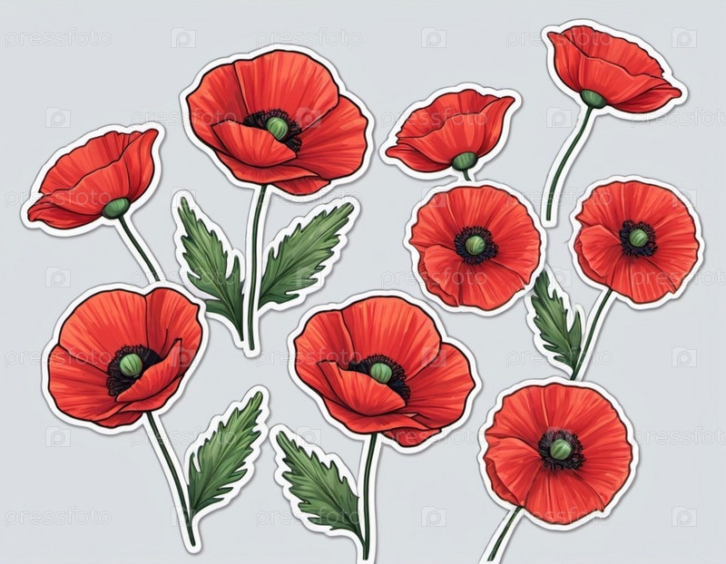 Красные маки, зеленые листья, стебли. Щенки изображены на различных стадиях цветения, причем некоторые полностью открыты, а другие в зародыше. Мягкая спина, создающая нежные романтические ощущения. Копируйте пространство. Открытка или макет