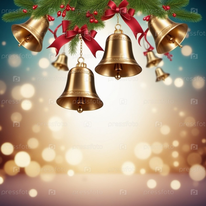 Золотые колокола висят на фоне копирования пространства. Колокола находятся в фокусе, с их сложными деталями. Изображение вызывает чувство праздника и праздника, что делает его идеальным для праздничных проектов