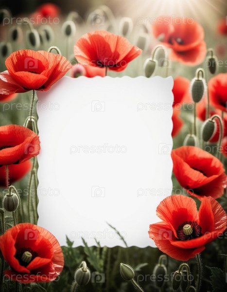 Красные маки с зелеными листьями и стеблями. Маки изображены в различных стадиях цветения, некоторые полностью открыты, а другие в зародыше. Мягкая спина, создающая деликатное и романтическое ощущение