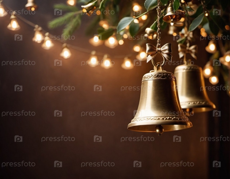 Золотые колокола висят на фоне копирования пространства. Колокола находятся в фокусе, с их сложными деталями. Изображение вызывает чувство праздника и праздника, что делает его идеальным для праздничных проектов