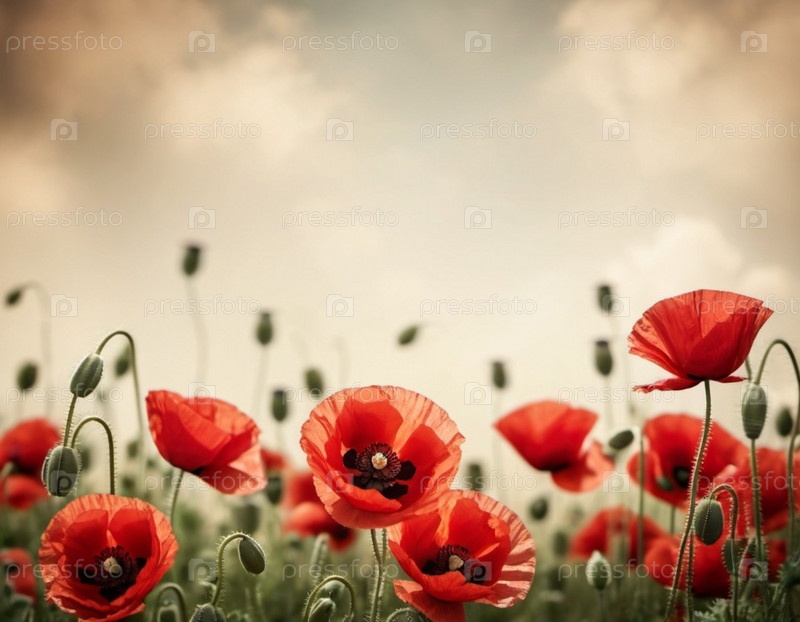 Красные маки с зелеными листьями и стеблями. Маки изображены в различных стадиях цветения, некоторые полностью открыты, а другие в зародыше. Мягкая спина, создающая деликатное и романтическое ощущение