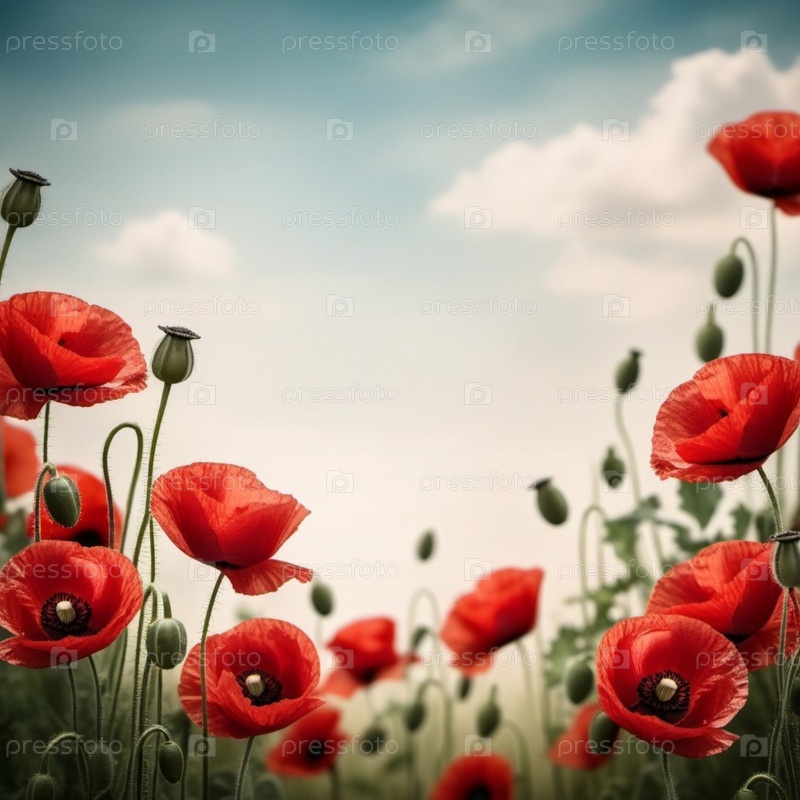 Красные маки, зеленые листья, стебли. Щенки изображены на различных стадиях цветения, причем некоторые полностью открыты, а другие в зародыше. Мягкая спина, создающая нежные романтические ощущения. Копируйте пространство. Открытка или макет