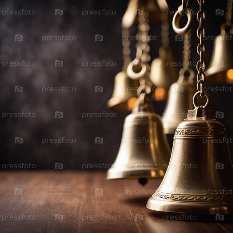 Золотые колокола висят на фоне копирования пространства. Колокола находятся в фокусе, с их сложными деталями. Изображение вызывает чувство праздника и праздника, что делает его идеальным для праздничных проектов