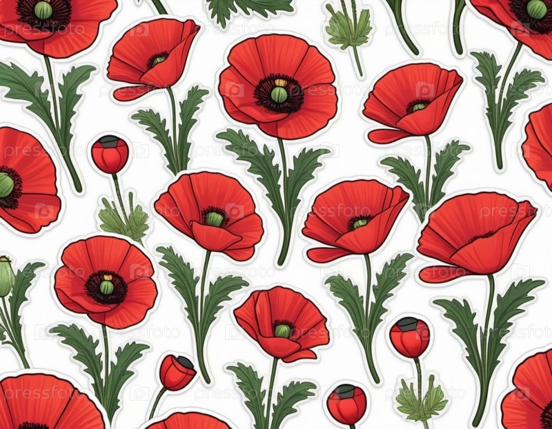 Красные маки с зелеными листьями и стеблями. Маки изображены в различных стадиях цветения, некоторые полностью открыты, а другие в зародыше. Мягкая спина, создающая деликатное и романтическое ощущение