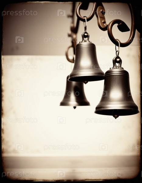 Золотые колокола висят на фоне копирования пространства. Колокола находятся в фокусе, с их сложными деталями. Изображение вызывает чувство праздника и праздника, что делает его идеальным для праздничных проектов