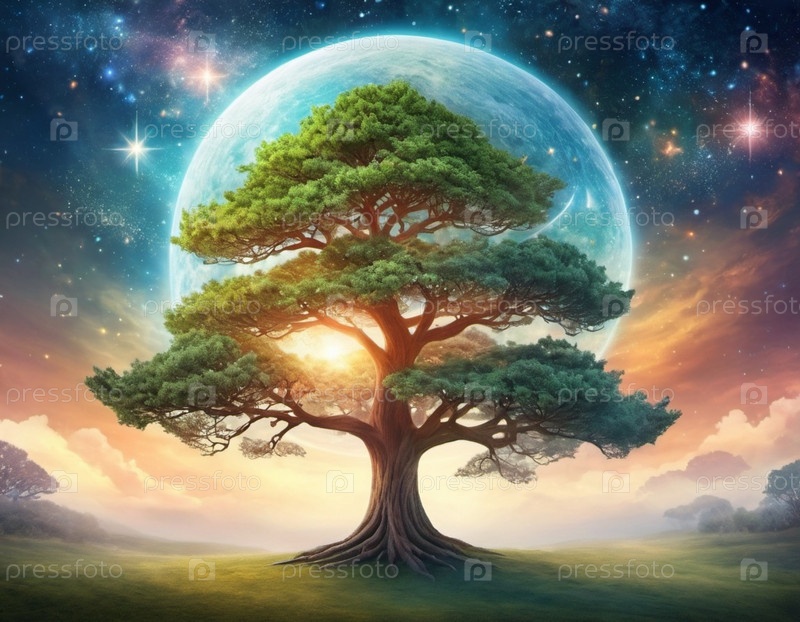 Одинокое дерево стоит высоко на фоне полнолуния и звездного ночного неба. Деревья тянутся к небесам. Луна бросает теплое, эфирное свечение на пейзаж, создавая ощущение тайны и удивления