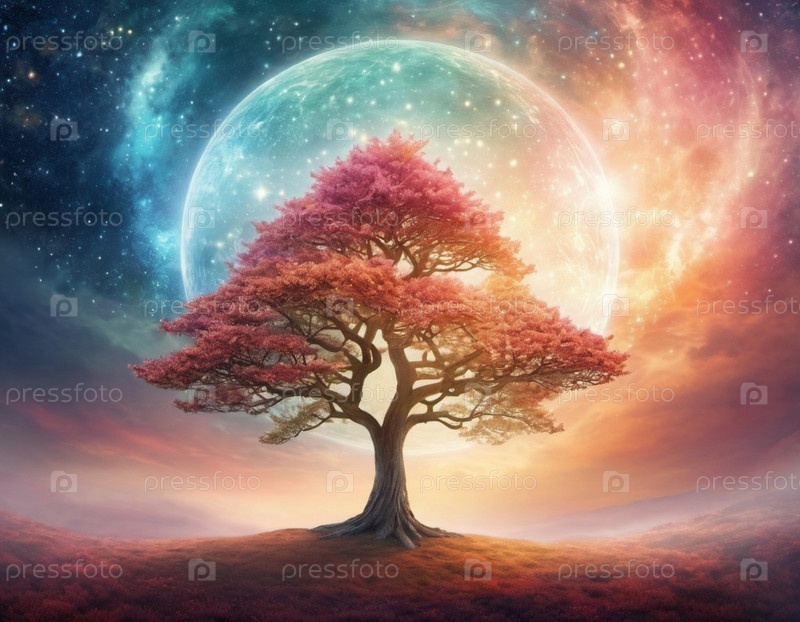 Одинокое дерево стоит высоко на фоне полнолуния и звездного ночного неба. Деревья тянутся к небесам. Луна бросает теплое, эфирное свечение на пейзаж, создавая ощущение тайны и удивления