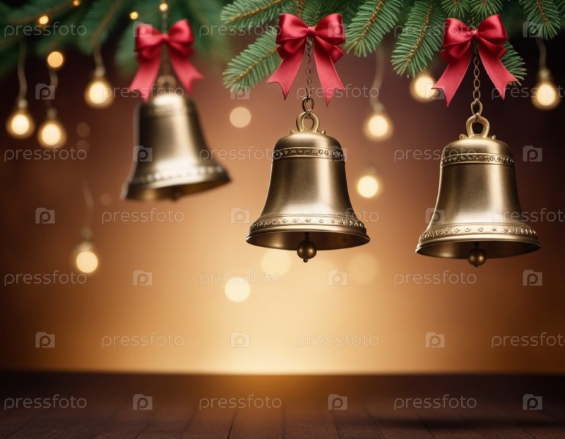 Золотые колокола висят на фоне копирования пространства. Колокола находятся в фокусе, с их сложными деталями. Изображение вызывает чувство праздника и праздника, что делает его идеальным для праздничных проектов