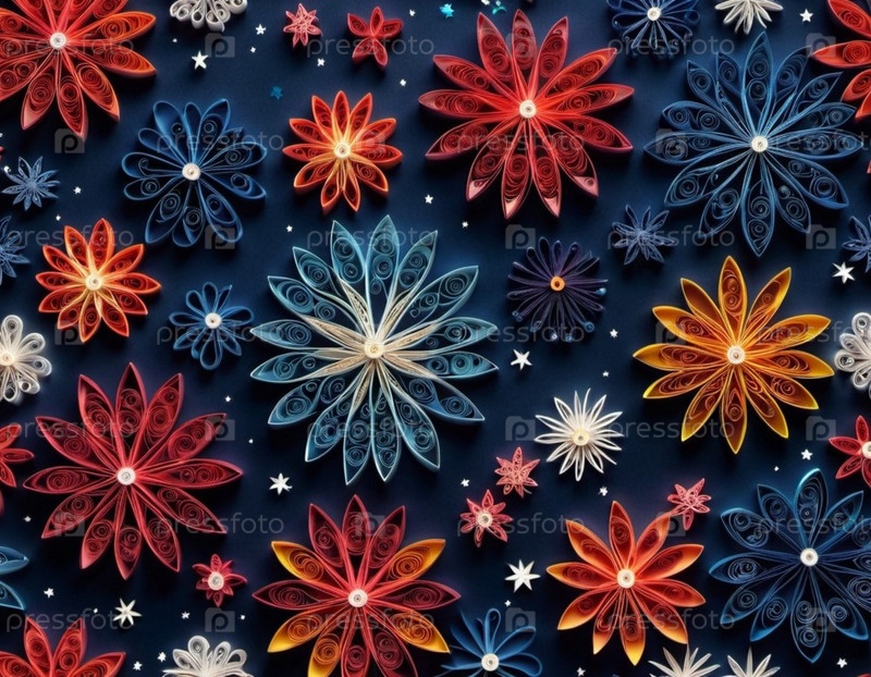 Бумажные цветы разных цветов и размеров, расположенные на темно-синем фоне. Цветы изготавливаются с использованием техники дрожи, причем каждый лепесток представляет собой свернутую полоску бумаги. Генерированный ИИ