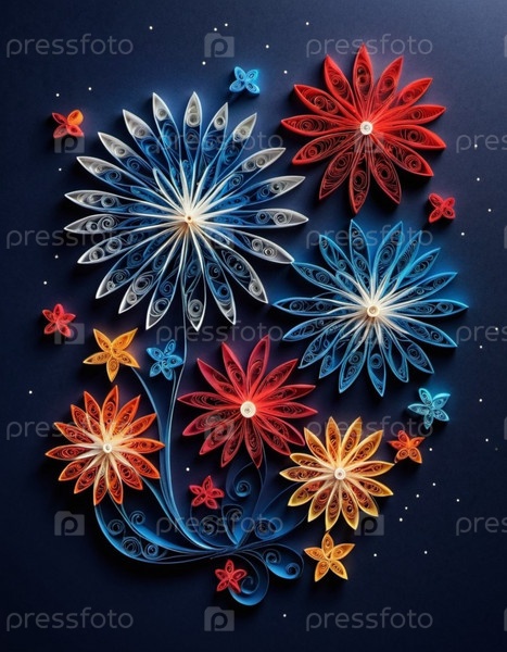 Бумажные цветы разных цветов и размеров, расположенные на темно-синем фоне. Цветы изготавливаются с использованием техники дрожи, причем каждый лепесток представляет собой свернутую полоску бумаги. Генерированный ИИ
