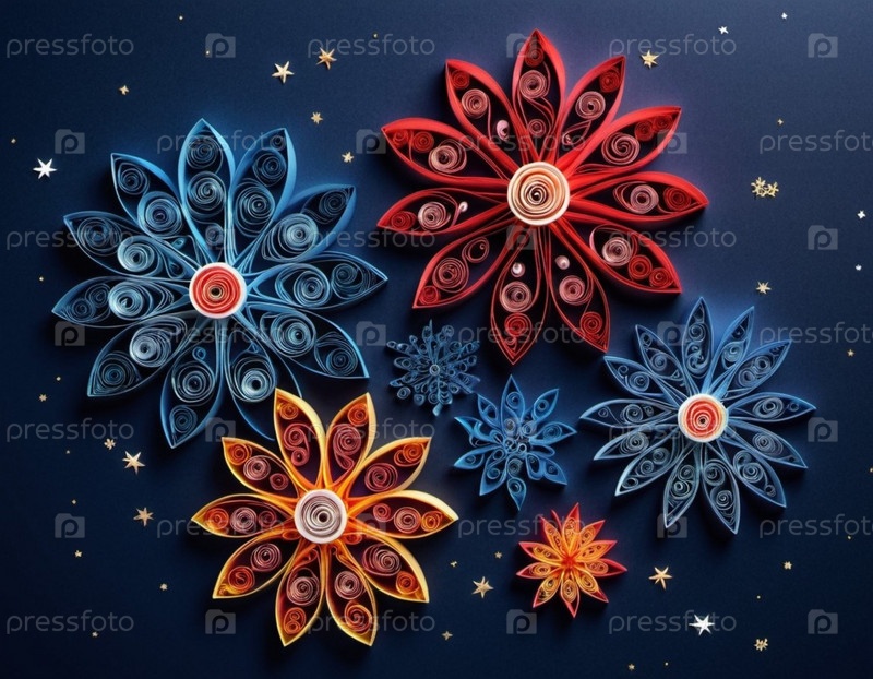 Бумажные цветы разных цветов и размеров, расположенные на темно-синем фоне. Цветы изготавливаются с использованием техники дрожи, причем каждый лепесток представляет собой свернутую полоску бумаги. Генерированный ИИ