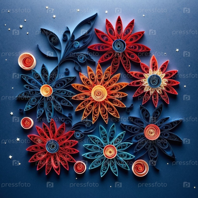 Бумажные цветы разных цветов и размеров, расположенные на темно-синем фоне. Цветы изготавливаются с использованием техники дрожи, причем каждый лепесток представляет собой свернутую полоску бумаги. Генерированный ИИ