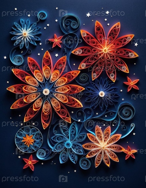 Бумажные цветы разных цветов и размеров, расположенные на темно-синем фоне. Цветы изготавливаются с использованием техники дрожи, причем каждый лепесток представляет собой свернутую полоску бумаги. Генерированный ИИ