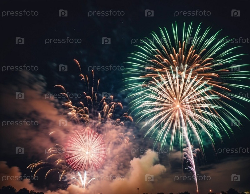 Яркий показ фейерверков освещает ночное небо. Большие вспышки света освещают темное полотно выше, создавая завораживающее зрелище цвета и движения. Генерированный ИИ. Праздничный фон