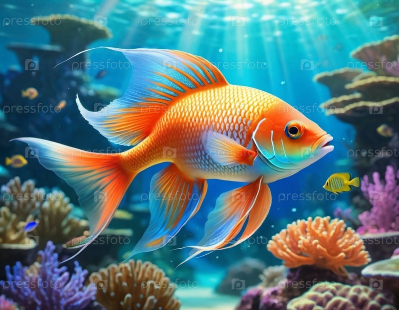 Яркие оранжево-бело-желто-красные рифовые рыбы плавают через коралловый риф. Солнечные лучи пронзают морскую воду. Разнообразие животных. Гидросфера экологии. Антропогенный фактор, влияющий на гибель коралловых рифов. ИИ