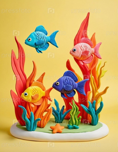 Красочная сцена плейдоу, изображающая подводный пейзаж с рыбой и водорослями. Рыбы бывают разных оттенков оранжевого, фиолетового и желтого. Аквариум или глубокое море. Детская фотография. ИИ. Пластиковая рыба