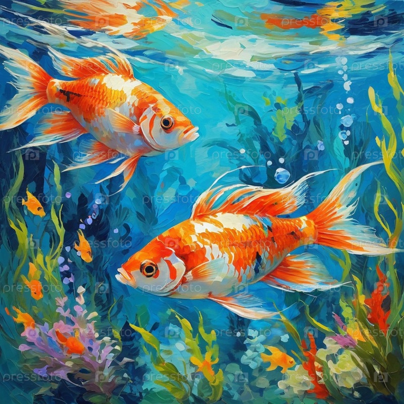 Золотые рыбки плавают в яркой синей подводной среде, их чешуя мерцает в солнечном свете, который фильтрует поверхность. Пышные зеленые водоросли и красочный отпуск добавляют красоты сцене. Аквариум. ИИ