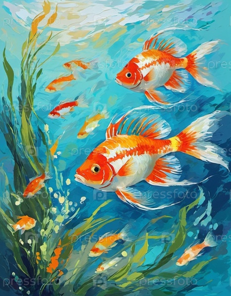 Золотые рыбки плавают в яркой синей подводной среде, их чешуя мерцает в солнечном свете, который фильтрует поверхность. Пышные зеленые водоросли и красочный отпуск добавляют красоты сцене. Аквариум. ИИ