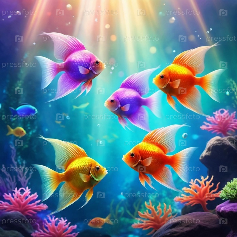 Яркие оранжево-бело-желто-красные рифовые рыбы плавают через коралловый риф. Солнечные лучи пронзают морскую воду. Разнообразие животных. Гидросфера экологии. Антропогенный фактор, влияющий на гибель коралловых рифов. ИИ