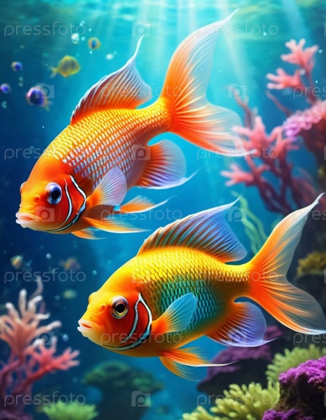 Яркие оранжево-бело-желто-красные рифовые рыбы плавают через коралловый риф. Солнечные лучи пронзают морскую воду. Разнообразие животных. Гидросфера экологии. Антропогенный фактор, влияющий на гибель коралловых рифов. ИИ