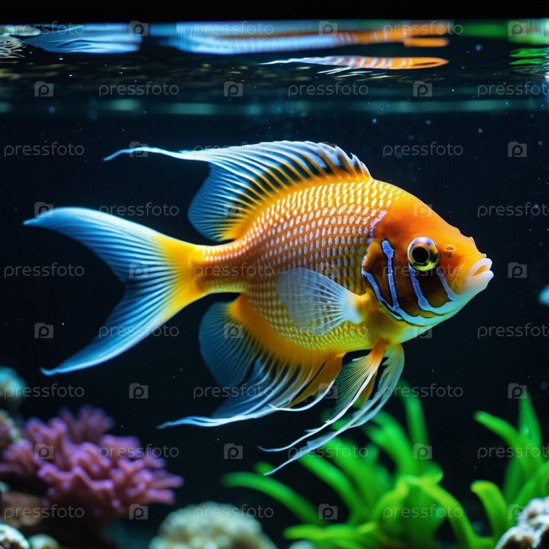 Красочные рыбы плавают изящно в хорошо освещенном аквариуме. Танк украшен кораллом, растениями и гравием, создавая яркую подводную сцену. Подводный мир. Аквариумы как хобби. генерируемый